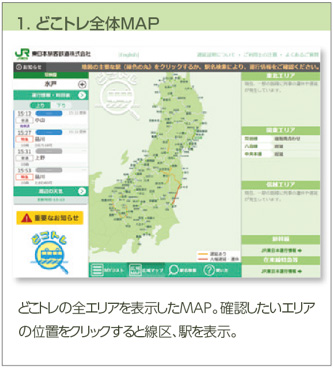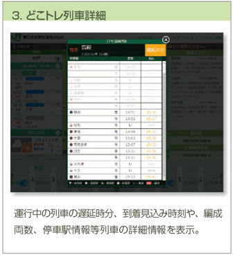 パソコン・スマートフォン等から列車走行位置や遅延等の運行情報をリアルタイムに取得できるサービス。併せて、行き先や編成両数、列車種別を次列車案内に表示するとともに、現在運行している列車ごとの停車駅情報、到着見込み時刻、各駅の時刻表情報等の列車詳細情報も確認が可能です。スマートフォン上で、どこトレからJR東日本アプリへ直接リンクしており、JR東日本全エリアの運行情報をシームレスに閲覧することができます。