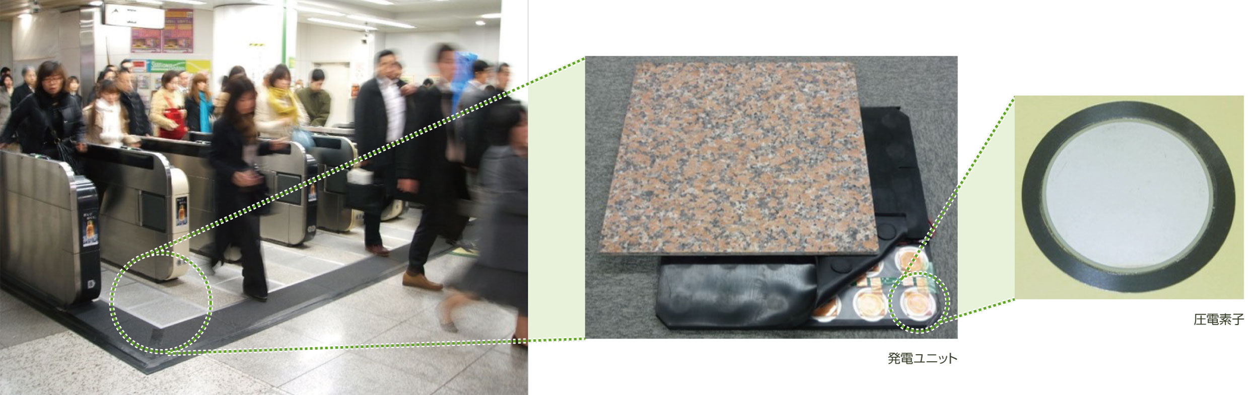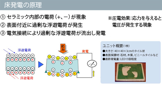 床発電システムは、歩行者が床に与えるエネルギーを電力に変換するシステムです。床に圧電素子を敷き詰めた発電ユニットを設置し、そこから電力を取り出します。