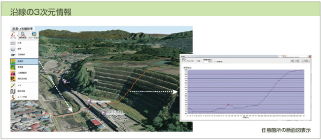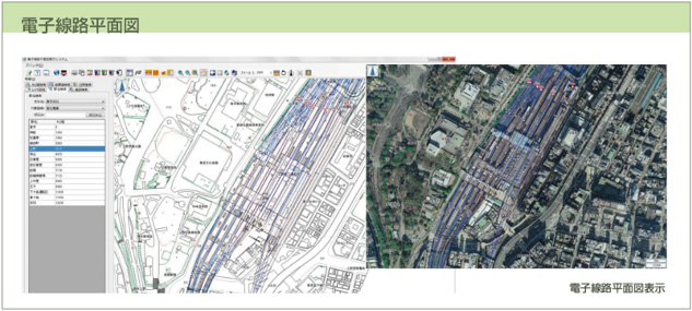 電子線路平面図、空中写真、全方位パノラマ映像等の大量のデータを一元管理する鉄道空間情報管理システムです。