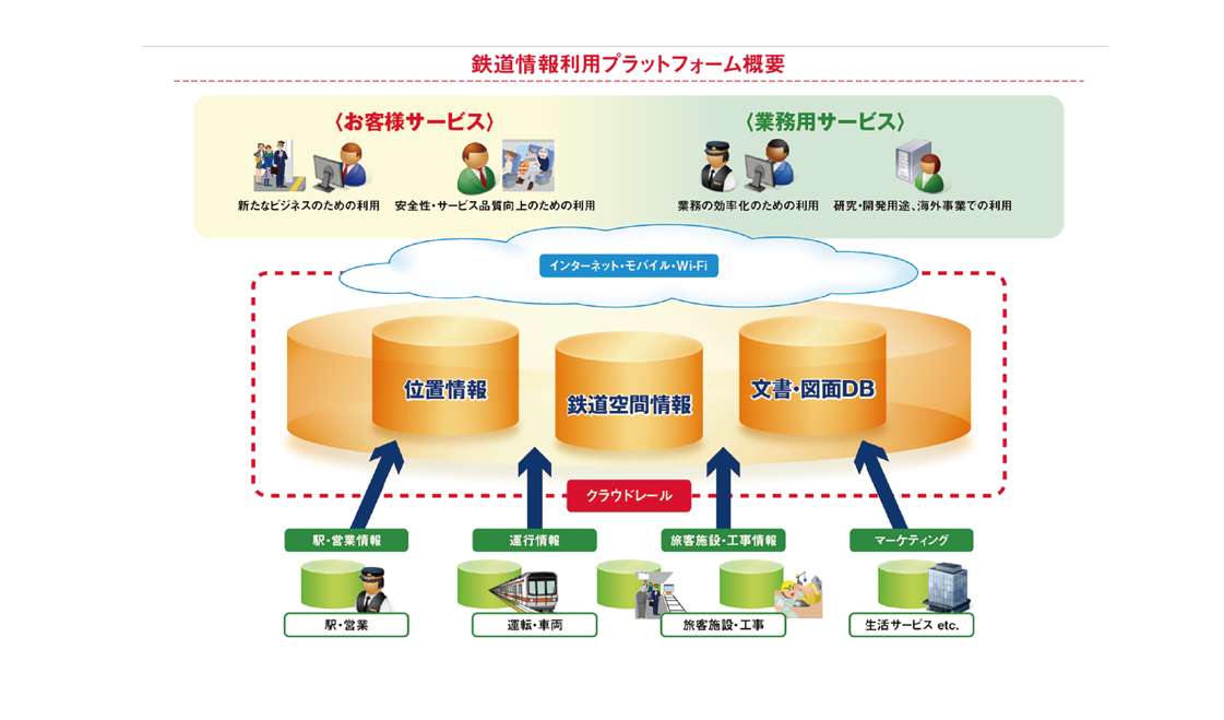 鉄道に関するさまざまな情報を集約・整理・最適化した、鉄道情報利用プラットフォーム、それが「クラウドレール」です。利用者はクラウドレールから目的ごとに横断的な情報を入手でき、情報の効果的な利活用が可能となります。