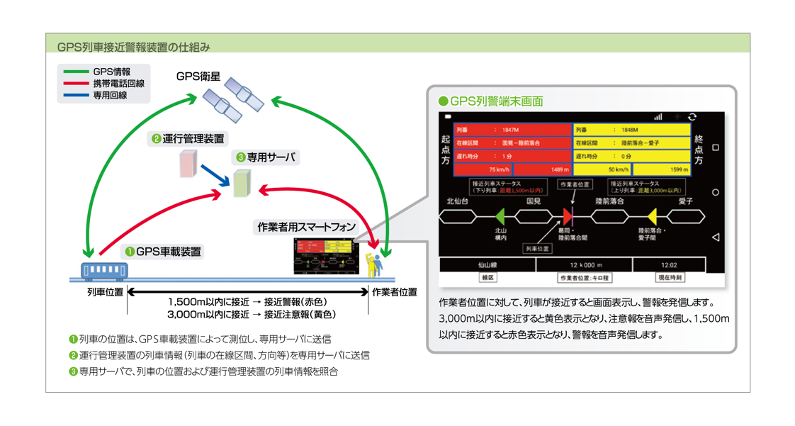現場作業者が持つスマートフォンのGPS機能と鉄道車両に搭載したGPS車載装置から、それぞれの位置を測位し、作業者に対して列車が接近していることを知らせる装置です。