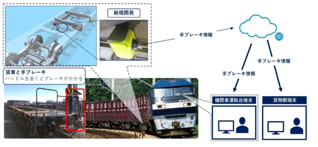 貨物列車の安全性向上を目的に、これまで列車の出発前に担当社員が目視で実施していたコンテナ車の手ブレーキ状態の確認作業を遠隔からも検知・確認できるシステムです。