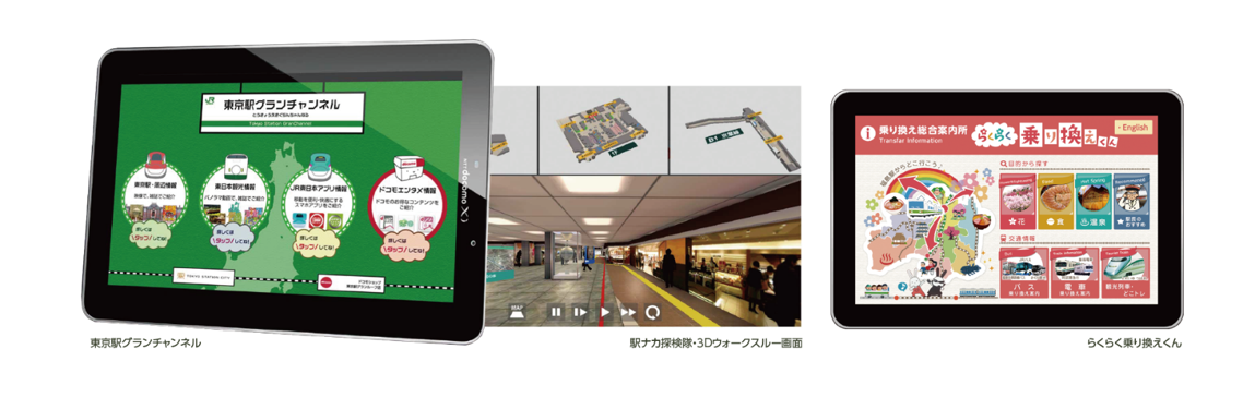 屋内(地下街・駅構内)での確実な位置測位を可能にする測位システムと、3次元モデルの構築により、複雑な駅構内を3Dウォークスルーでリアルタイムにナビゲーションするシステム。タブレット端末による駅周辺や観光地等の情報を発信するデジタルコンテンツサービスも展開しています。