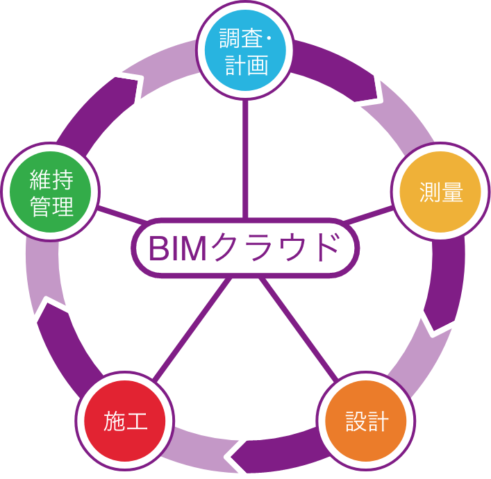 共通プラットフォーム「BIMクラウド」は、調査・計画・測量、設計、施工段階から維持管理までの全プロセスに関わるデータを一元管理します。