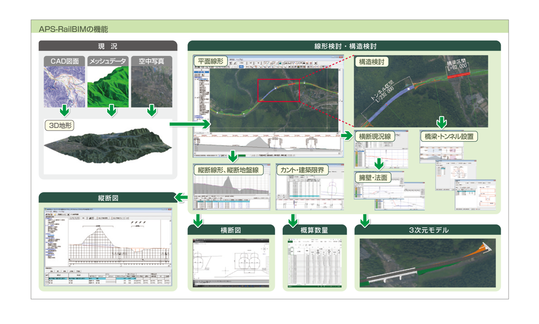 既存の鉄道線形計算システム「APS-Railway」に、3次元地形モデルをベースとした土工計算や高架橋、橋梁、トンネルの構造形式の自動配置、3次元構造モデルの自動生成、概算工事費算出用の数量計算を追加した鉄道BIM計画システム「APS-RailBIM」を提供します。これにより、調査・計画段階で3次元モデルによる詳細なシミュレーションが可能になり、意思決定のスピードアップに貢献します。