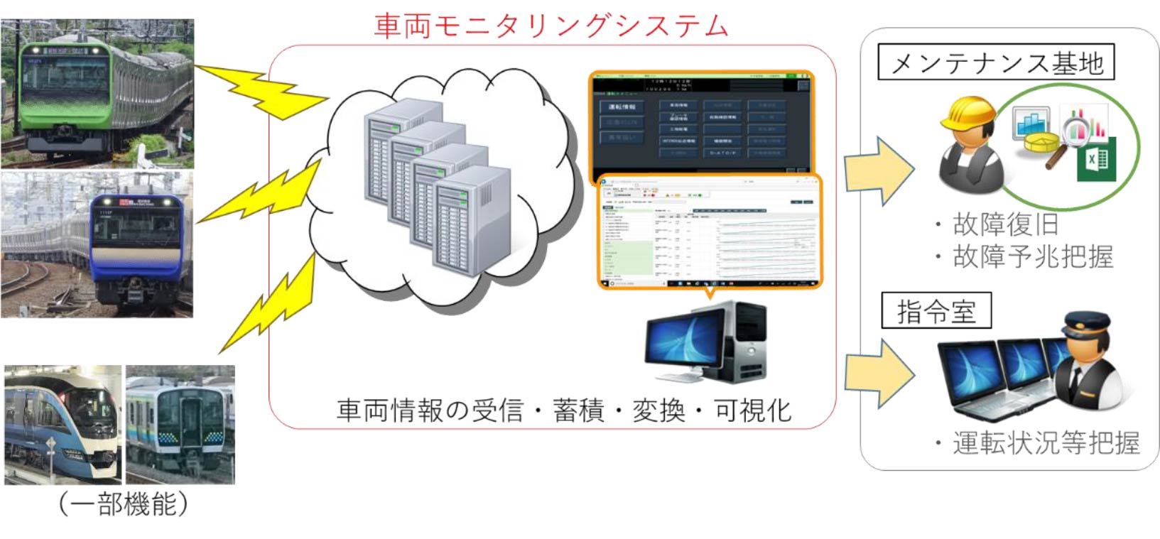 E235系(山手線、横須賀・総武快速線)車両に搭載されている列車情報管理装置(INTEROS)から送信される車両機器の情報(モニタリングデータ)の受信・蓄積・変換などを行うシステムを構築しJR東日本様に提供しています。また、このシステムは、従来手動で行っていた各機器のシステム更新を車両にリモート送信する機能にも対応しています。