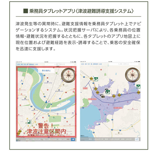 乗務員が携帯するタブレット端末上で、マニュアルや状況に応じた情報を入手できるシステム。輸送障害時には、運行情報等を迅速に共有することが可能で、適切な顧客案内と輸送品質の向上をサポートします。