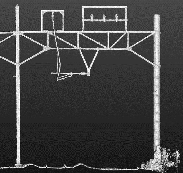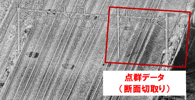 地上レーザ計測などの三次元レーザスキャナや写真測量の測量技術を用いて正確な三次元点群データの取得や各種図面の提供を行っています。三次元点群データや作成した図面は、鉄道や駅舎の設計や軌道の配線計画の基礎資料などの鉄道工事に多く利活用されています。