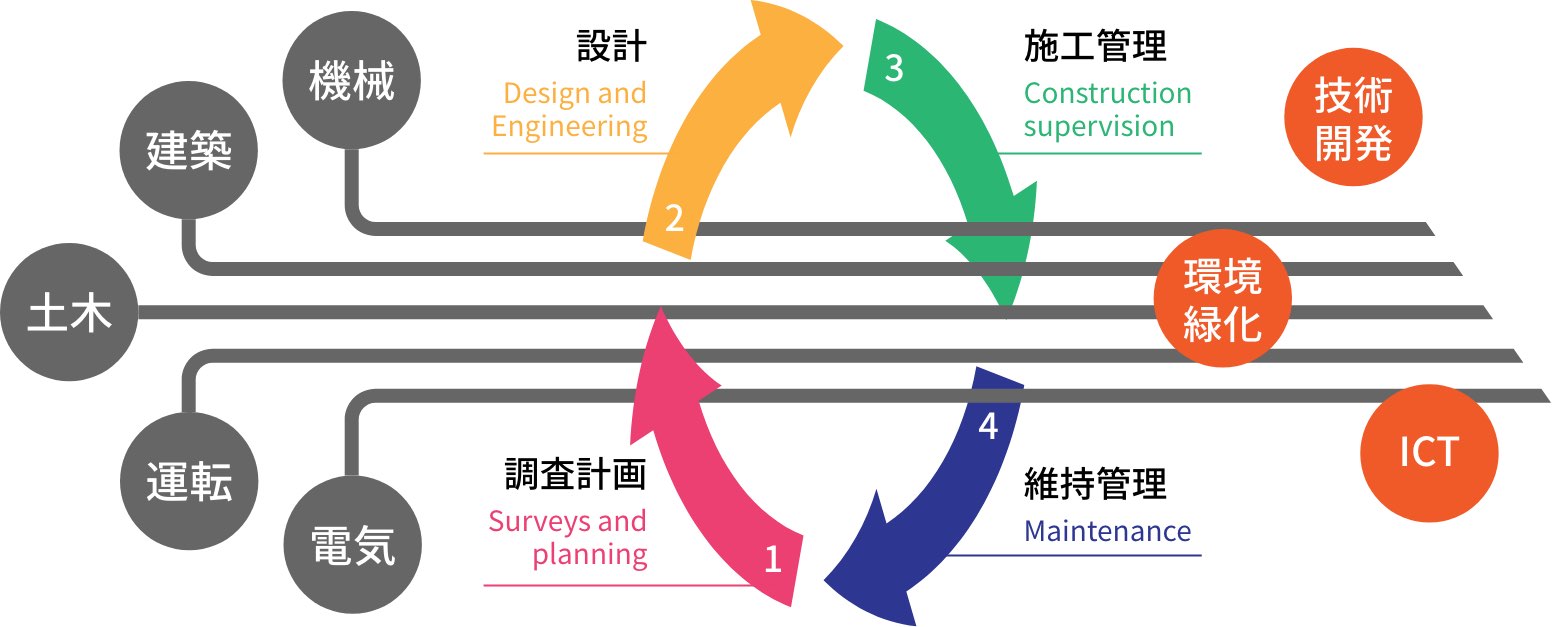 鉄道施設の調査(大都市コンセンサス調査、交通量調査等)、駅まちづくり計画、施工計画(BIM等を活用したフロントローディング)、測量(ドローン等を使った3次元測量)、土質調査、電気設備計画、輸送計画
